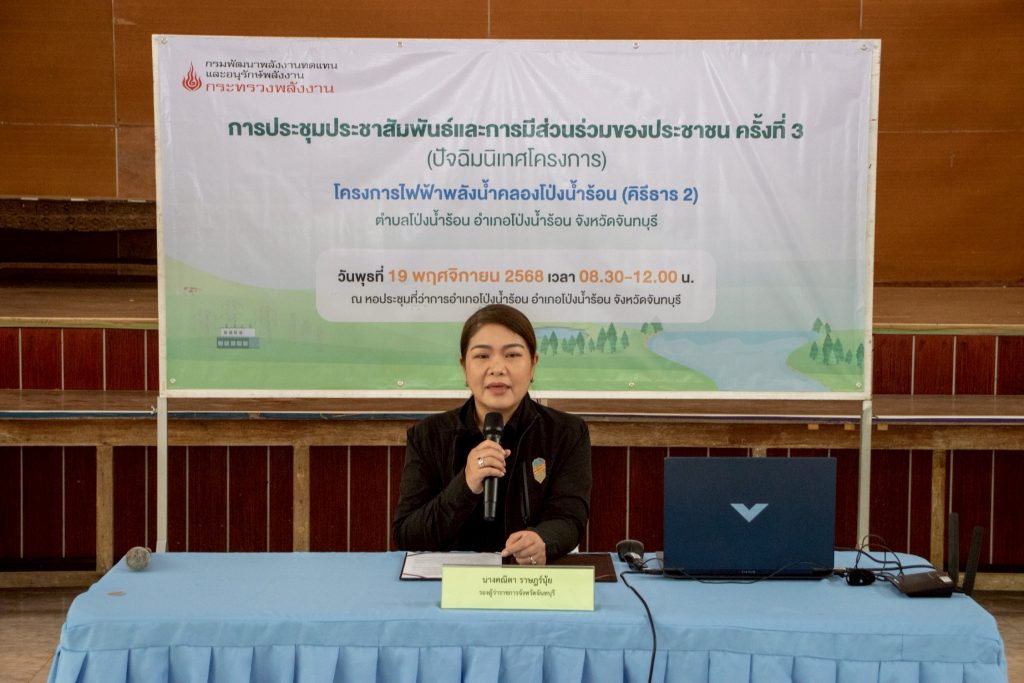 ข่าวประชาสัมพันธ์ปัจฉิมนิเทศโครงการศึกษาความเหมาะสม โครงการไฟฟ้าพลังน้ำคลองโป่งน้ำร้อน (คิรีธาร 2) ตำบลโป่งน้ำร้อน อำเภอโป่งน้ำร้อน จังหวัดจันทบุรี และโครงการไฟฟ้าพลังน้ำคลองทุ่งเพลบน ตำบลพลวง อำเภอเขาคิชฌกูฏ จังหวัดจันทบุรี panya_admin / พฤศจิกายน 20, 2568 ปัจฉิมนิเทศโครงการศึ […]